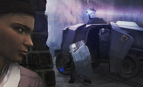 I also thought that Metrocops with riot shields were a gimmee for gravity-gun play--say you still couldn't grab the cops, but you could grab the shields and then launch them at the other cops, or hold one up in front of you to block shots. Great fun.(This first image is the only one I really noodled with in a fit of George Lucasing before posting. Feel free to examine the original version to the left from November of 2005 and tell me Han shot first or whatever.)